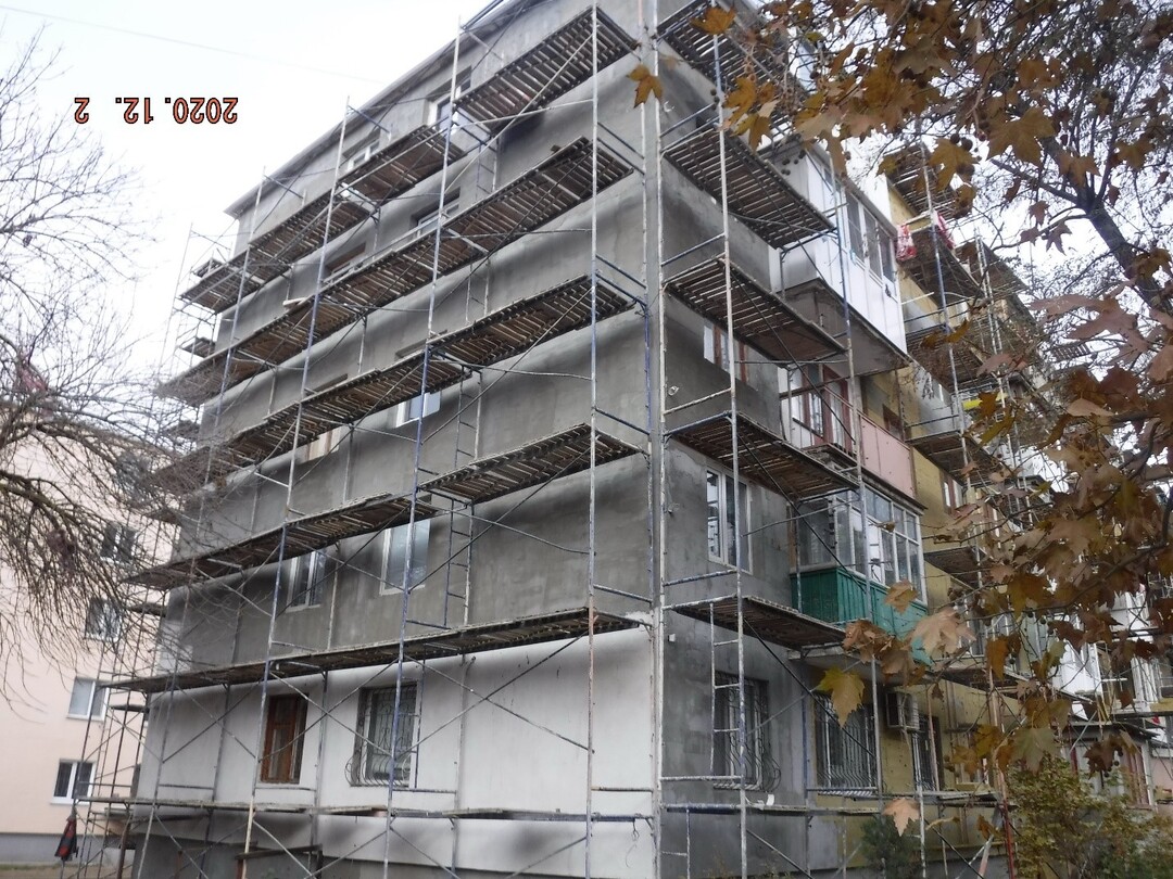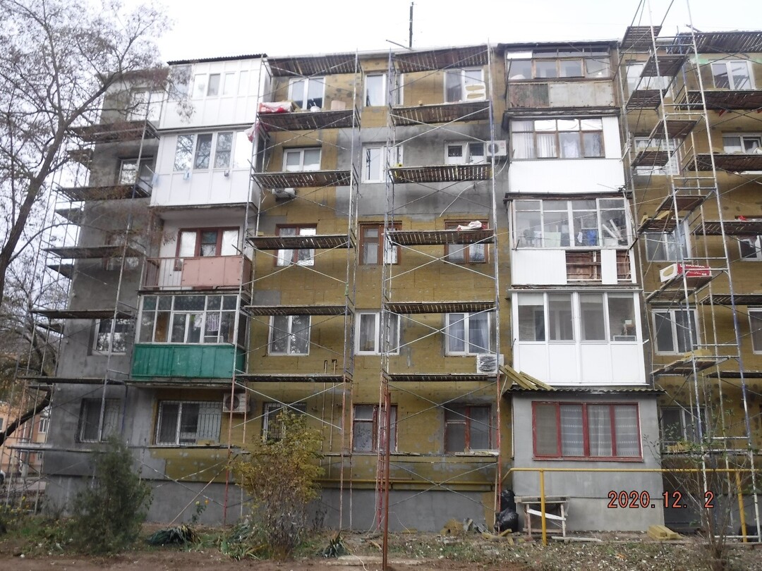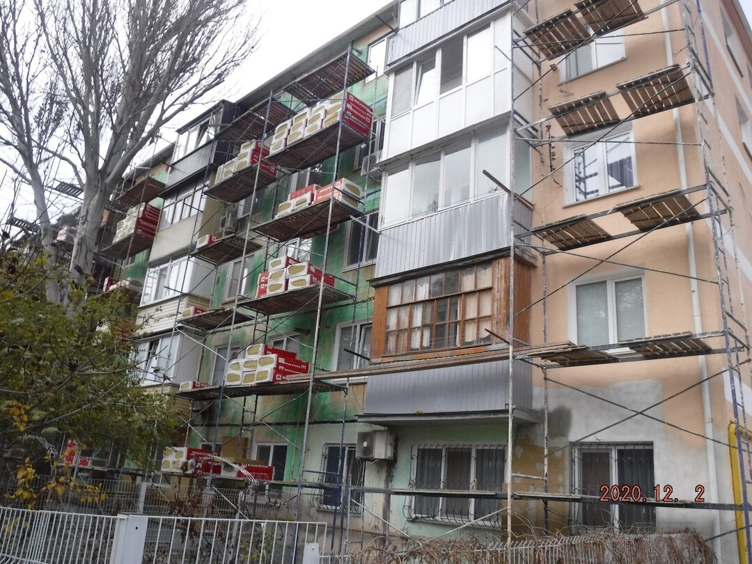 В ходе ремонтных работ произведена отбивка старой штукатурки, зачистка фасада от старой краски, огрунтовка, выравнивание клевым составом, монтаж утеплителя, оштукатуривание клеевым составом по сетке, устройство декоративной штукатурки, окраска фасада.